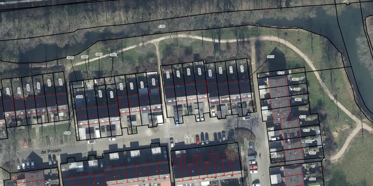 de Praam 100 is gelegen op kadastraal perceel TIE00H3691. Deze kadastrale aanduiding is uniek en wordt gebruikt door het Kadaster om eigendomsrechten en andere zakelijke rechten vast te leggen. Het perceel maakt onderdeel uit van de kadastrale gemeente Tiel.