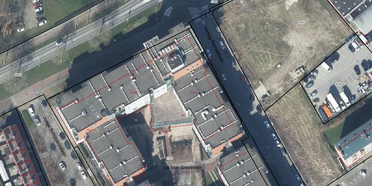 Het perceel waarop De Vier Gravinnen 106 staat heeft een oppervlakte van 9636 m². Dit is een zeer groot perceel. De perceeloppervlakte wordt geregistreerd door het Kadaster. Gedetailleerde informatie over de maten van dit perceel kunt u vinden in het rapport Kadastrale kaart met maatvoering van De Vier Gravinnen 106.