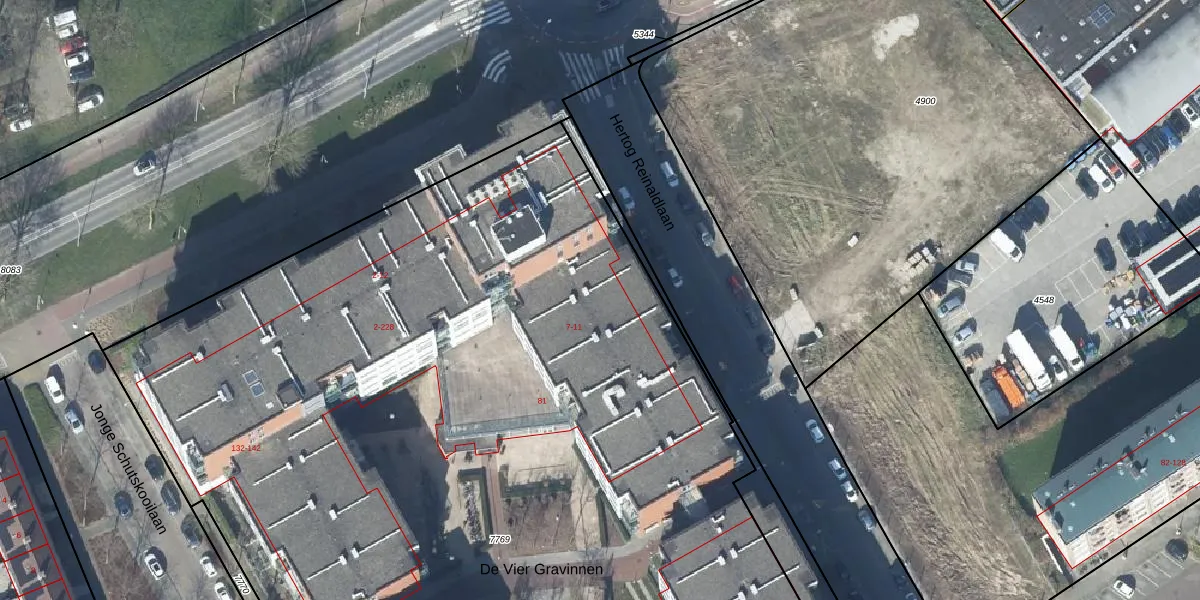 Het perceel waarop De Vier Gravinnen 108 staat heeft een oppervlakte van 9636 m². Dit is een zeer groot perceel. De perceeloppervlakte wordt geregistreerd door het Kadaster. Gedetailleerde informatie over de maten van dit perceel kunt u vinden in het rapport Kadastrale kaart met maatvoering van De Vier Gravinnen 108.