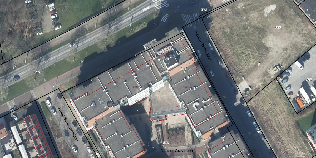 Het perceel waarop De Vier Gravinnen 116 staat heeft een oppervlakte van 9636 m². Dit is een zeer groot perceel. De perceeloppervlakte wordt geregistreerd door het Kadaster. Gedetailleerde informatie over de maten van dit perceel kunt u vinden in het rapport Kadastrale kaart met maatvoering van De Vier Gravinnen 116.
