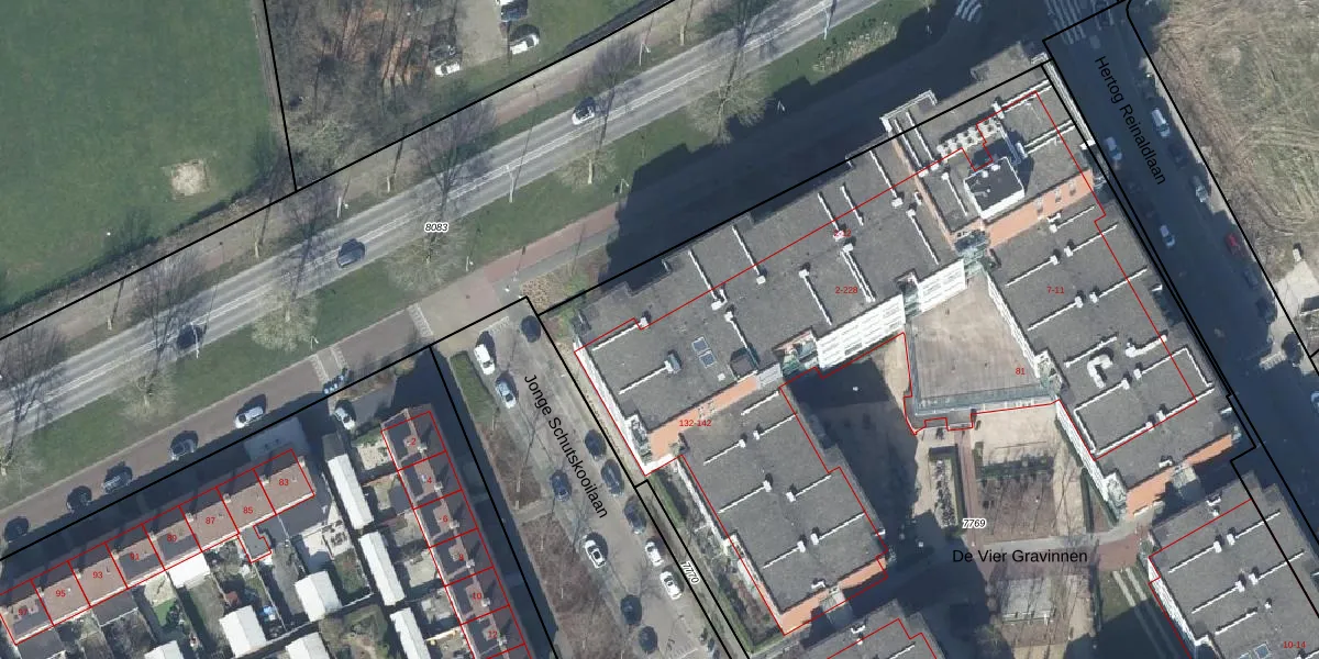 Het perceel waarop De Vier Gravinnen 12 staat heeft een oppervlakte van 9636 m². Dit is een zeer groot perceel. De perceeloppervlakte wordt geregistreerd door het Kadaster. Gedetailleerde informatie over de maten van dit perceel kunt u vinden in het rapport Kadastrale kaart met maatvoering van De Vier Gravinnen 12.
