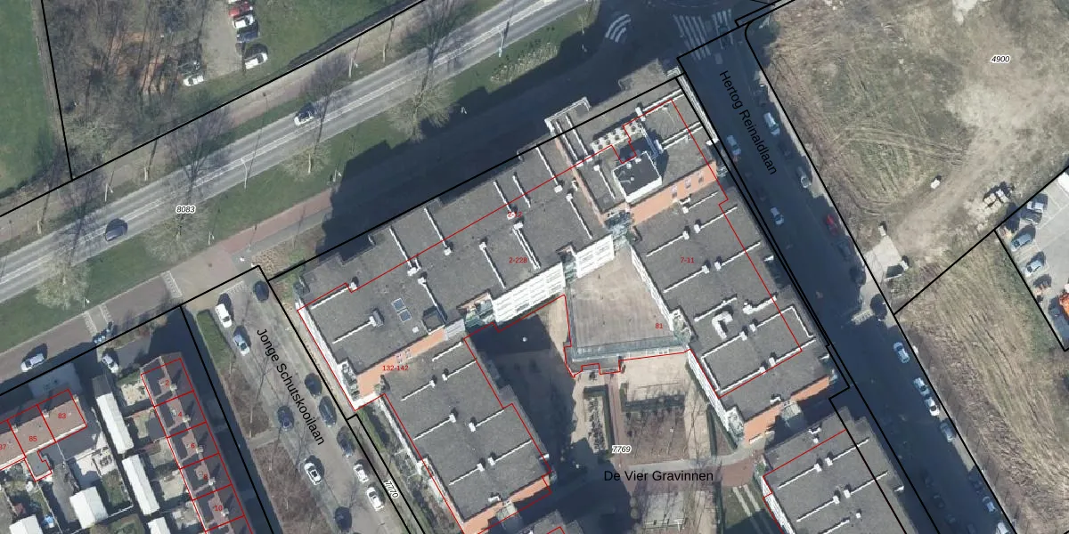 Het perceel waarop De Vier Gravinnen 120 staat heeft een oppervlakte van 9636 m². Dit is een zeer groot perceel. De perceeloppervlakte wordt geregistreerd door het Kadaster. Gedetailleerde informatie over de maten van dit perceel kunt u vinden in het rapport Kadastrale kaart met maatvoering van De Vier Gravinnen 120.
