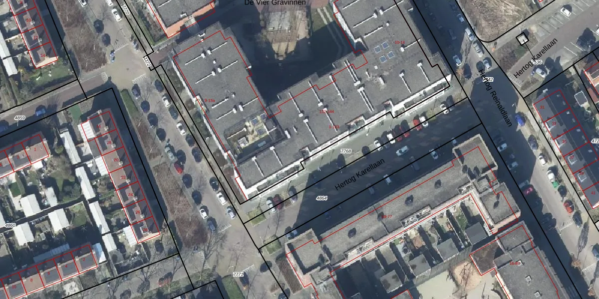 Het perceel waarop De Vier Gravinnen 129 staat heeft een oppervlakte van 9636 m². Dit is een zeer groot perceel. De perceeloppervlakte wordt geregistreerd door het Kadaster. Gedetailleerde informatie over de maten van dit perceel kunt u vinden in het rapport Kadastrale kaart met maatvoering van De Vier Gravinnen 129.