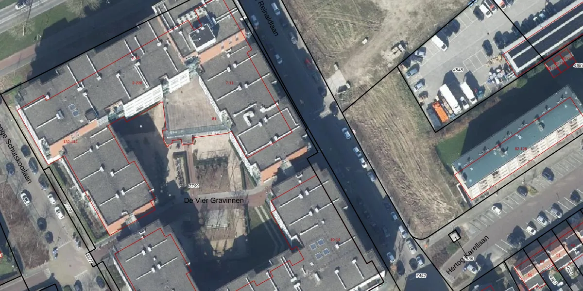 Het perceel waarop De Vier Gravinnen 152 staat heeft een oppervlakte van 9636 m². Dit is een zeer groot perceel. De perceeloppervlakte wordt geregistreerd door het Kadaster. Gedetailleerde informatie over de maten van dit perceel kunt u vinden in het rapport Kadastrale kaart met maatvoering van De Vier Gravinnen 152.