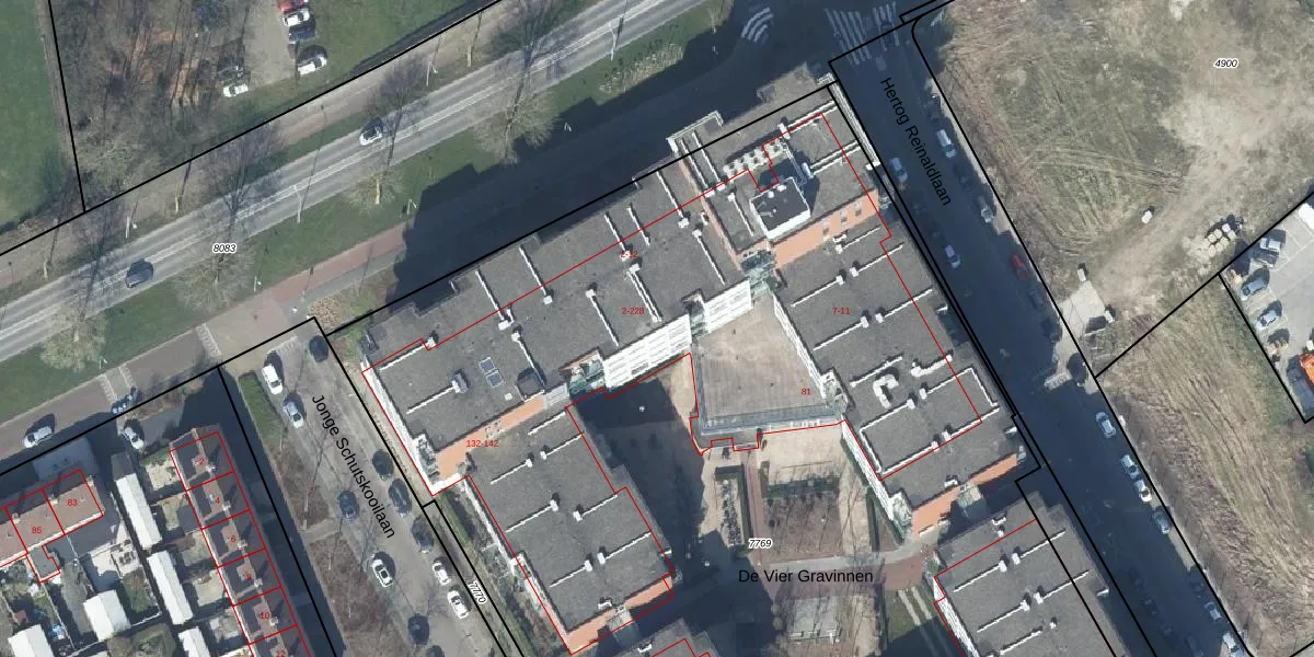 Het perceel waarop De Vier Gravinnen 176 staat heeft een oppervlakte van 9636 m². Dit is een zeer groot perceel. De perceeloppervlakte wordt geregistreerd door het Kadaster. Gedetailleerde informatie over de maten van dit perceel kunt u vinden in het rapport Kadastrale kaart met maatvoering van De Vier Gravinnen 176.