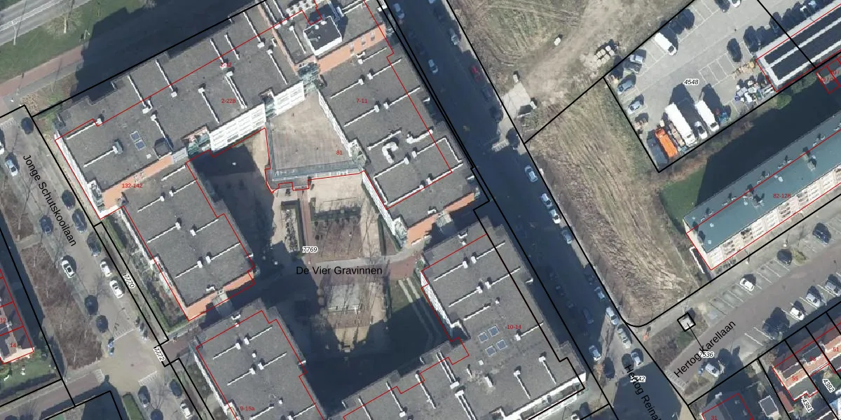 Het perceel waarop De Vier Gravinnen 18 staat heeft een oppervlakte van 9636 m². Dit is een zeer groot perceel. De perceeloppervlakte wordt geregistreerd door het Kadaster. Gedetailleerde informatie over de maten van dit perceel kunt u vinden in het rapport Kadastrale kaart met maatvoering van De Vier Gravinnen 18.