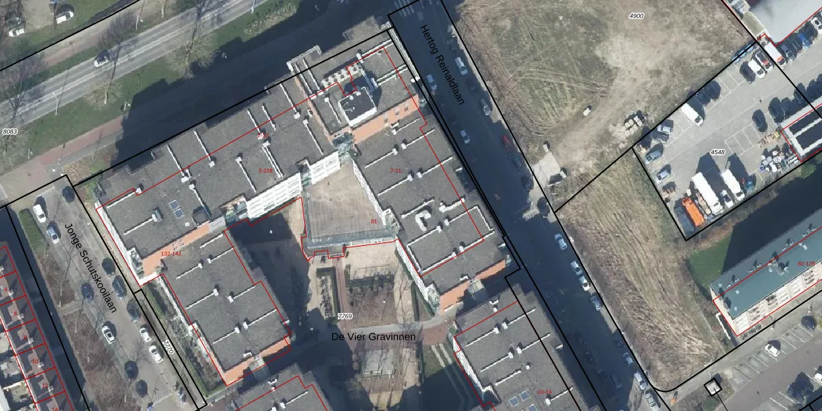 Het perceel waarop De Vier Gravinnen 30 staat heeft een oppervlakte van 9636 m². Dit is een zeer groot perceel. De perceeloppervlakte wordt geregistreerd door het Kadaster. Gedetailleerde informatie over de maten van dit perceel kunt u vinden in het rapport Kadastrale kaart met maatvoering van De Vier Gravinnen 30.