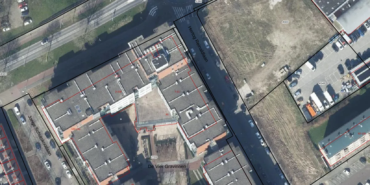 Het perceel waarop De Vier Gravinnen 36 staat heeft een oppervlakte van 9636 m². Dit is een zeer groot perceel. De perceeloppervlakte wordt geregistreerd door het Kadaster. Gedetailleerde informatie over de maten van dit perceel kunt u vinden in het rapport Kadastrale kaart met maatvoering van De Vier Gravinnen 36.