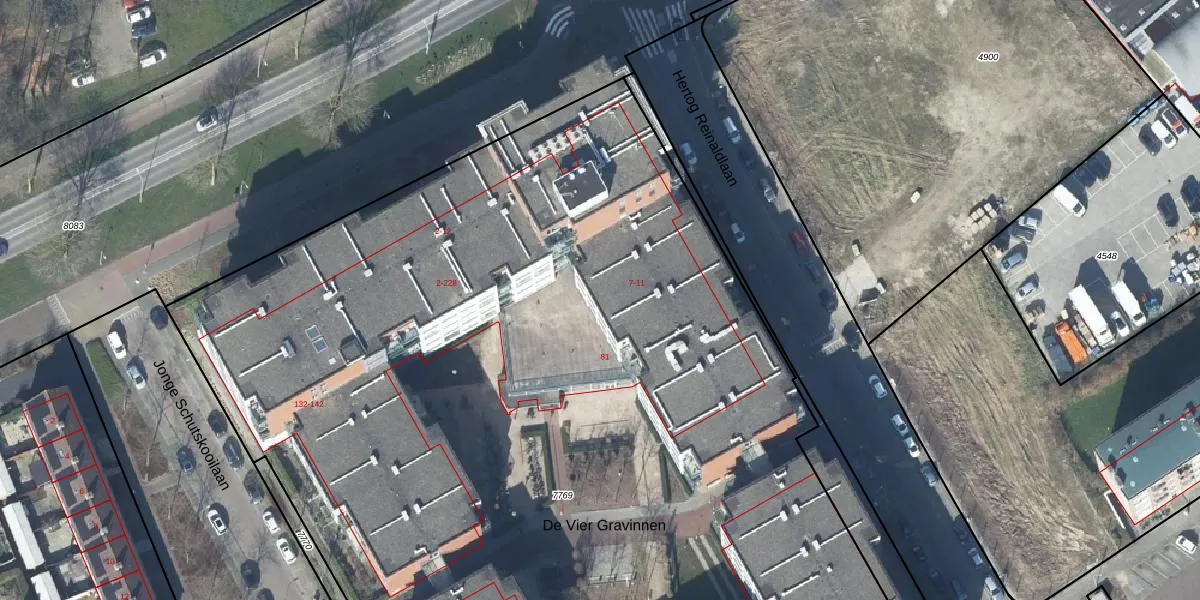 Het perceel waarop De Vier Gravinnen 4 staat heeft een oppervlakte van 9636 m². Dit is een zeer groot perceel. De perceeloppervlakte wordt geregistreerd door het Kadaster. Gedetailleerde informatie over de maten van dit perceel kunt u vinden in het rapport Kadastrale kaart met maatvoering van De Vier Gravinnen 4.