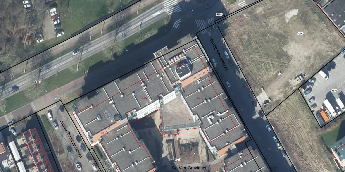 Het perceel waarop De Vier Gravinnen 52 staat heeft een oppervlakte van 9636 m². Dit is een zeer groot perceel. De perceeloppervlakte wordt geregistreerd door het Kadaster. Gedetailleerde informatie over de maten van dit perceel kunt u vinden in het rapport Kadastrale kaart met maatvoering van De Vier Gravinnen 52.