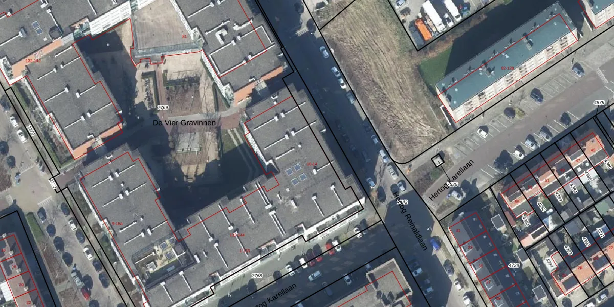 Het perceel waarop De Vier Gravinnen 55 staat heeft een oppervlakte van 9636 m². Dit is een zeer groot perceel. De perceeloppervlakte wordt geregistreerd door het Kadaster. Gedetailleerde informatie over de maten van dit perceel kunt u vinden in het rapport Kadastrale kaart met maatvoering van De Vier Gravinnen 55.