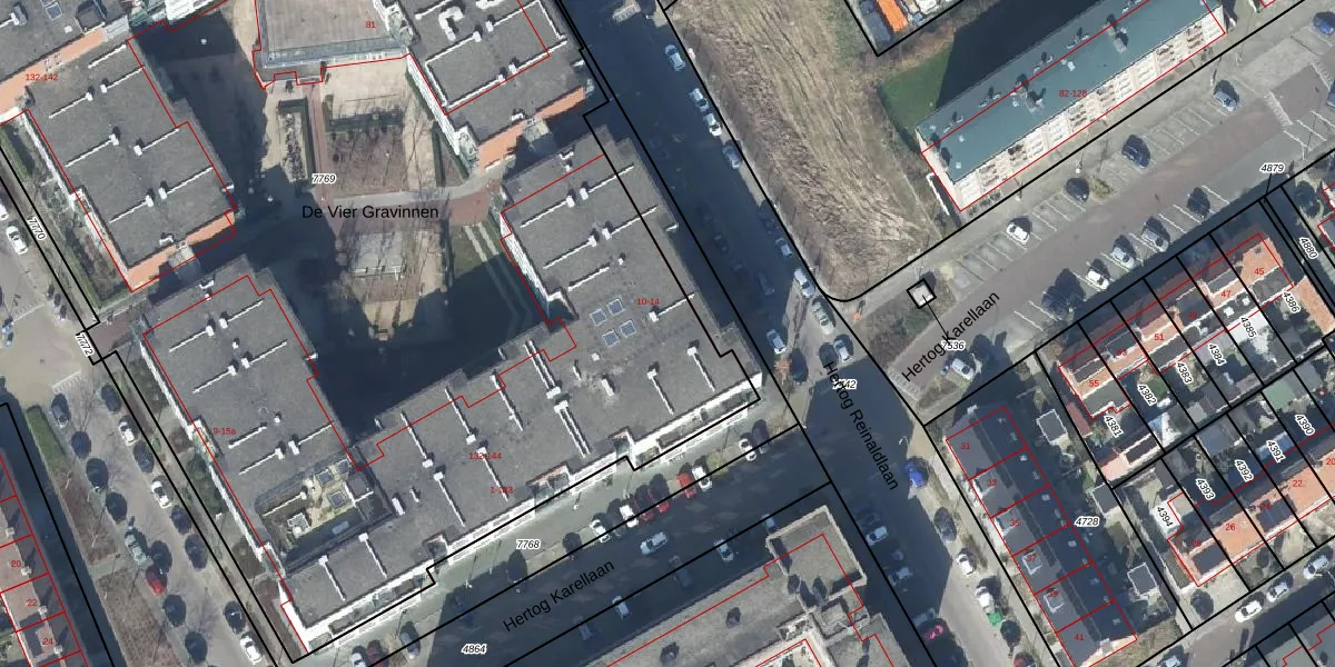 Het perceel waarop De Vier Gravinnen 57 staat heeft een oppervlakte van 9636 m². Dit is een zeer groot perceel. De perceeloppervlakte wordt geregistreerd door het Kadaster. Gedetailleerde informatie over de maten van dit perceel kunt u vinden in het rapport Kadastrale kaart met maatvoering van De Vier Gravinnen 57.