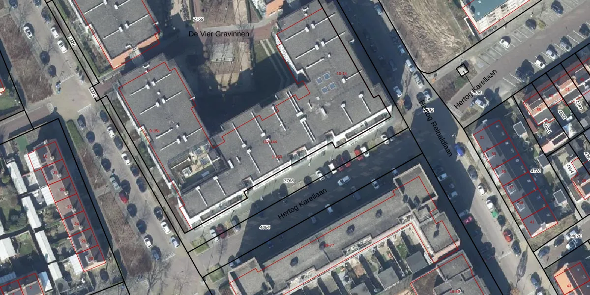 Het perceel waarop De Vier Gravinnen 69 staat heeft een oppervlakte van 9636 m². Dit is een zeer groot perceel. De perceeloppervlakte wordt geregistreerd door het Kadaster. Gedetailleerde informatie over de maten van dit perceel kunt u vinden in het rapport Kadastrale kaart met maatvoering van De Vier Gravinnen 69.
