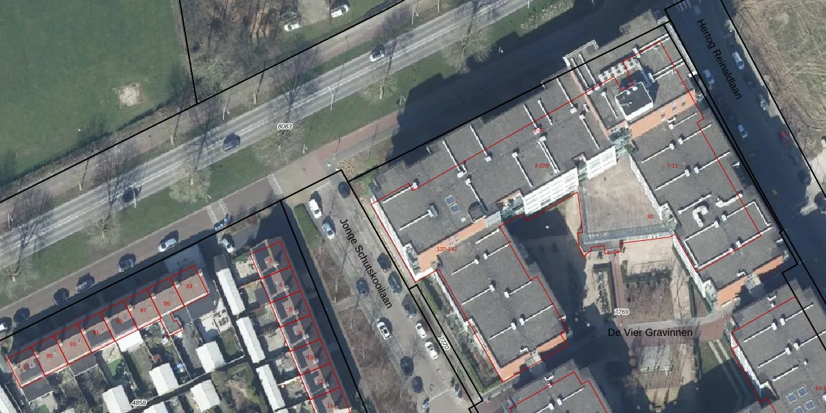 Het perceel waarop De Vier Gravinnen 72 staat heeft een oppervlakte van 9636 m². Dit is een zeer groot perceel. De perceeloppervlakte wordt geregistreerd door het Kadaster. Gedetailleerde informatie over de maten van dit perceel kunt u vinden in het rapport Kadastrale kaart met maatvoering van De Vier Gravinnen 72.