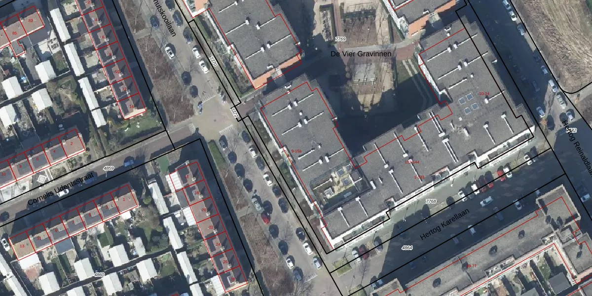 Het perceel waarop De Vier Gravinnen 91 staat heeft een oppervlakte van 9636 m². Dit is een zeer groot perceel. De perceeloppervlakte wordt geregistreerd door het Kadaster. Gedetailleerde informatie over de maten van dit perceel kunt u vinden in het rapport Kadastrale kaart met maatvoering van De Vier Gravinnen 91.
