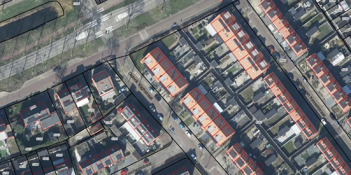 Het perceel waarop Diderik Vijghstraat 7 staat heeft een oppervlakte van 8560 m². Dit is een zeer groot perceel. De perceeloppervlakte wordt geregistreerd door het Kadaster. Gedetailleerde informatie over de maten van dit perceel kunt u vinden in het rapport Kadastrale kaart met maatvoering van Diderik Vijghstraat 7.