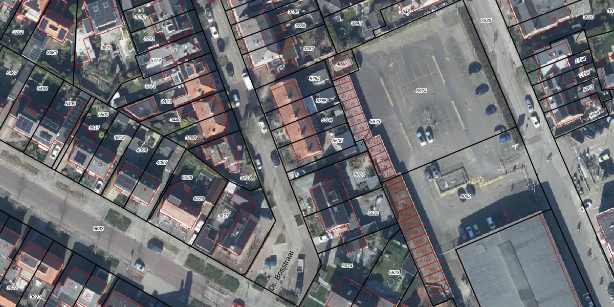 Dr. Bosstraat 8 is gelegen op kadastraal perceel TIE00D5505. Deze kadastrale aanduiding is uniek en wordt gebruikt door het Kadaster om eigendomsrechten en andere zakelijke rechten vast te leggen. Het perceel maakt onderdeel uit van de kadastrale gemeente Tiel.