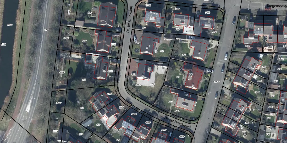 Dr. ter Braaklaan 3 is gelegen op kadastraal perceel TIE00H833. Deze kadastrale aanduiding is uniek en wordt gebruikt door het Kadaster om eigendomsrechten en andere zakelijke rechten vast te leggen. Het perceel maakt onderdeel uit van de kadastrale gemeente Tiel.