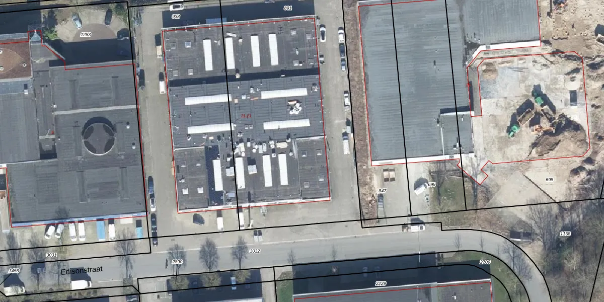 Het perceel waarop Edisonstraat 21-08 staat heeft een oppervlakte van 3075 m². Dit is een zeer groot perceel. De perceeloppervlakte wordt geregistreerd door het Kadaster. Gedetailleerde informatie over de maten van dit perceel kunt u vinden in het rapport Kadastrale kaart met maatvoering van Edisonstraat 21-08.