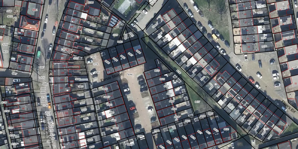 Eerste Sluisje 14 is gelegen op kadastraal perceel TIE00C8510. Deze kadastrale aanduiding is uniek en wordt gebruikt door het Kadaster om eigendomsrechten en andere zakelijke rechten vast te leggen. Het perceel maakt onderdeel uit van de kadastrale gemeente Tiel.