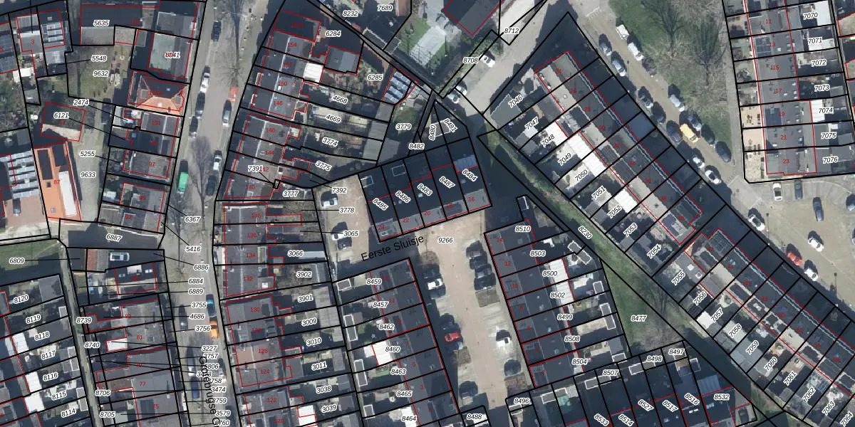 Het perceel waarop Eerste Sluisje 20 staat heeft een oppervlakte van 91 m². Dit is een klein perceel. De perceeloppervlakte wordt geregistreerd door het Kadaster. Gedetailleerde informatie over de maten van dit perceel kunt u vinden in het rapport Kadastrale kaart met maatvoering van Eerste Sluisje 20.