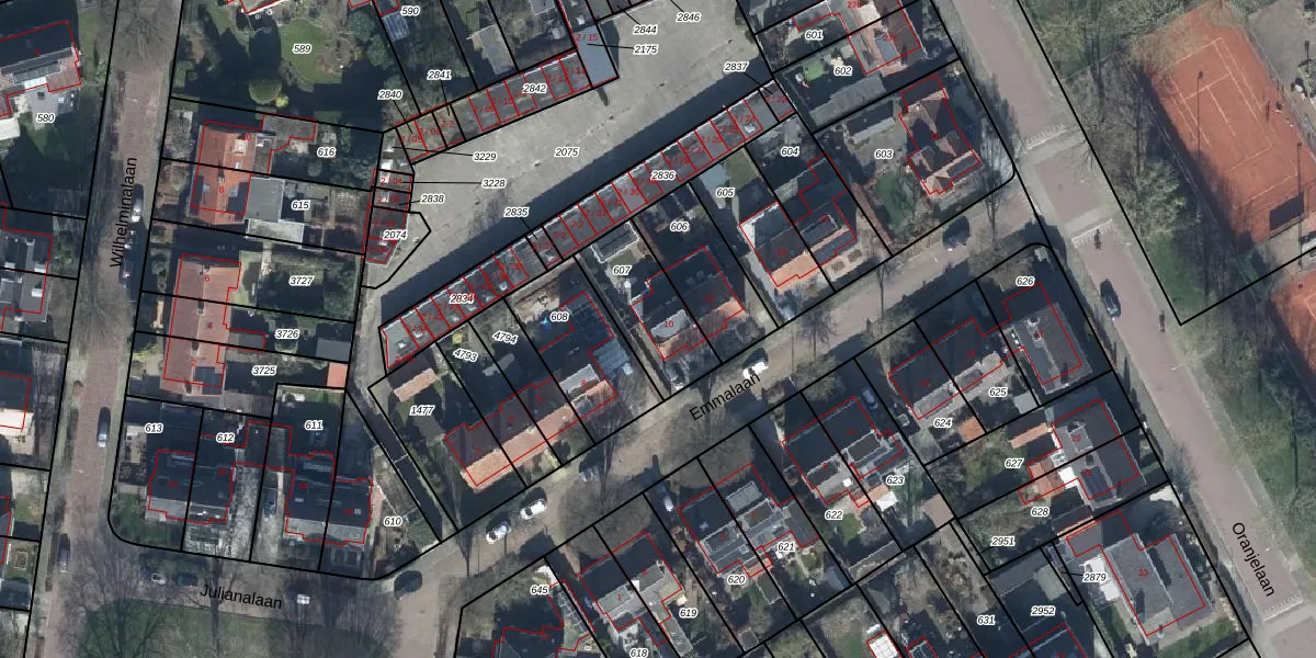 Emmalaan 10 is gelegen op kadastraal perceel TIE00H607. Deze kadastrale aanduiding is uniek en wordt gebruikt door het Kadaster om eigendomsrechten en andere zakelijke rechten vast te leggen. Het perceel maakt onderdeel uit van de kadastrale gemeente Tiel.