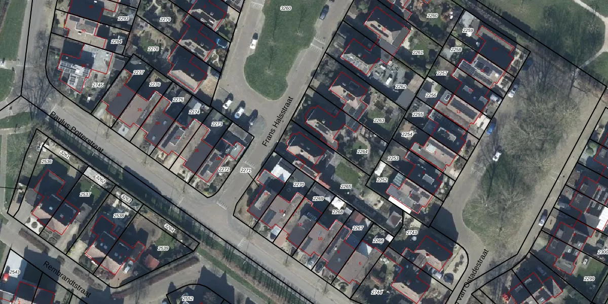Het perceel waarop Frans Halsstraat 2 staat heeft een oppervlakte van 520 m². Dit is een groot perceel. De perceeloppervlakte wordt geregistreerd door het Kadaster. Gedetailleerde informatie over de maten van dit perceel kunt u vinden in het rapport Kadastrale kaart met maatvoering van Frans Halsstraat 2.