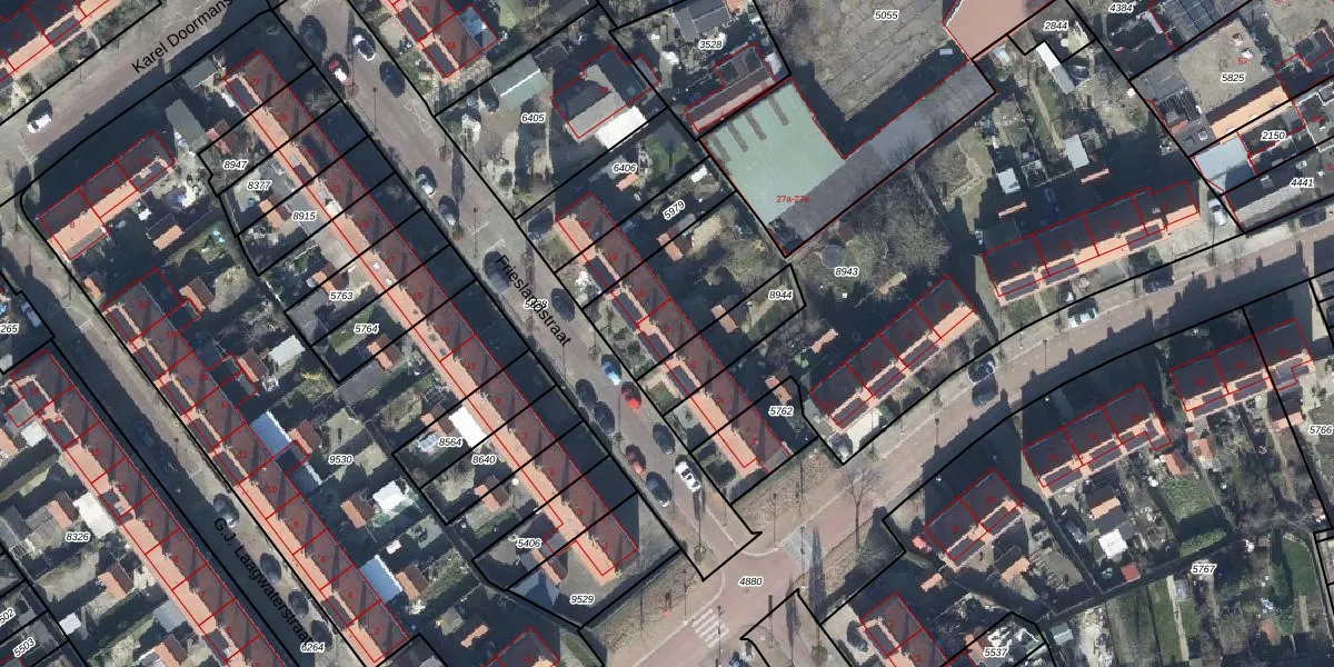 Het perceel waarop Frieslandstraat 8 staat heeft een oppervlakte van 2690 m². Dit is een zeer groot perceel. De perceeloppervlakte wordt geregistreerd door het Kadaster. Gedetailleerde informatie over de maten van dit perceel kunt u vinden in het rapport Kadastrale kaart met maatvoering van Frieslandstraat 8.
