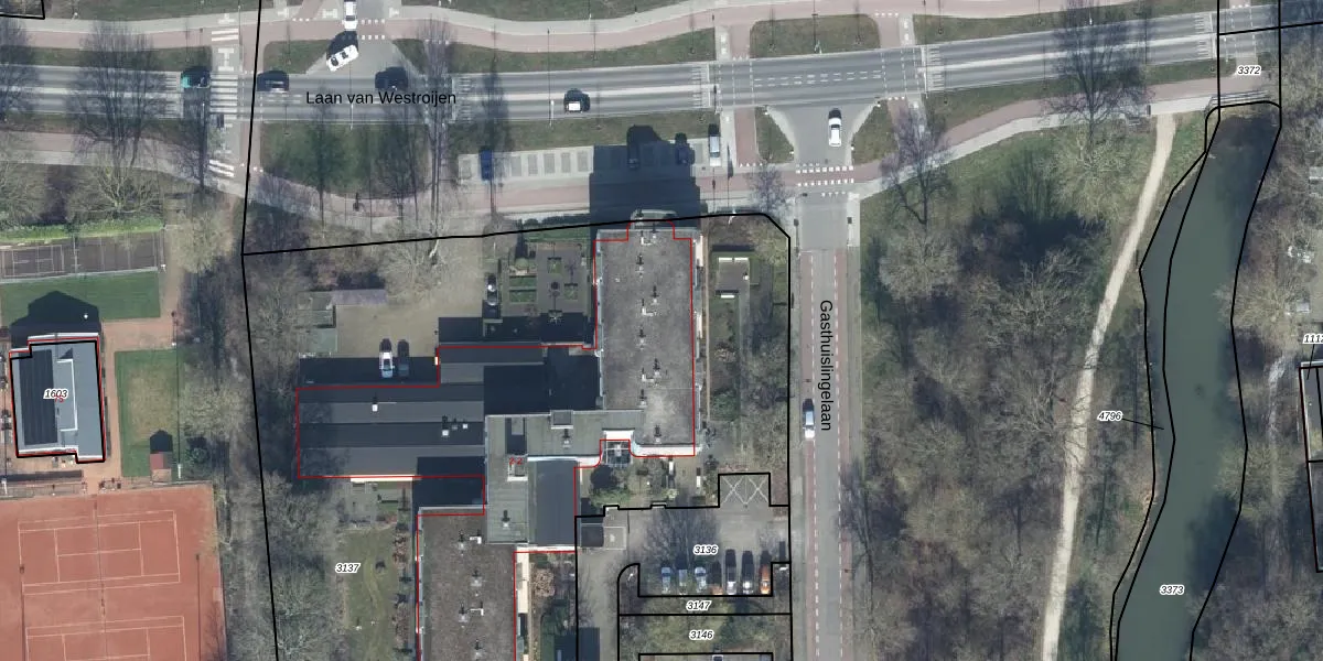 Het perceel waarop Gasthuislingelaan 2-115 staat heeft een oppervlakte van 5111 m². Dit is een zeer groot perceel. De perceeloppervlakte wordt geregistreerd door het Kadaster. Gedetailleerde informatie over de maten van dit perceel kunt u vinden in het rapport Kadastrale kaart met maatvoering van Gasthuislingelaan 2-115.