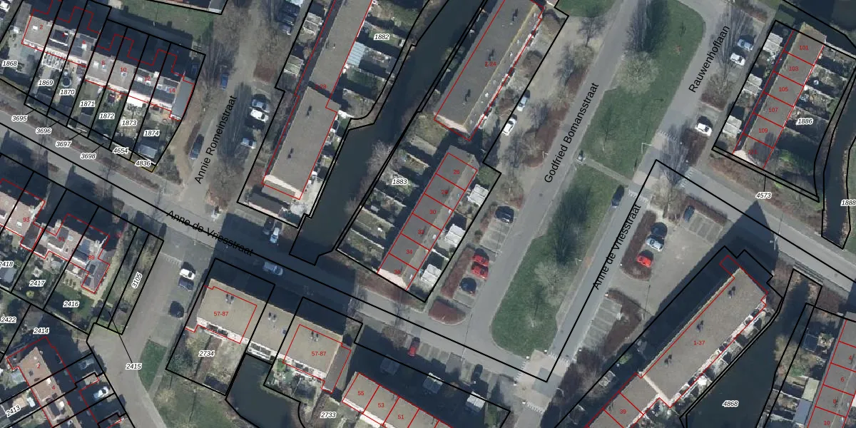 Het perceel waarop Godfried Bomansstraat 30 staat heeft een oppervlakte van 1610 m². Dit is een zeer groot perceel. De perceeloppervlakte wordt geregistreerd door het Kadaster. Gedetailleerde informatie over de maten van dit perceel kunt u vinden in het rapport Kadastrale kaart met maatvoering van Godfried Bomansstraat 30.