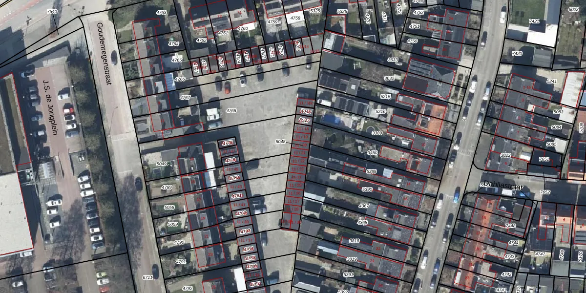 Goudenregenstraat 11-20 is gelegen op kadastraal perceel TIE00D5048. Deze kadastrale aanduiding is uniek en wordt gebruikt door het Kadaster om eigendomsrechten en andere zakelijke rechten vast te leggen. Het perceel maakt onderdeel uit van de kadastrale gemeente Tiel.
