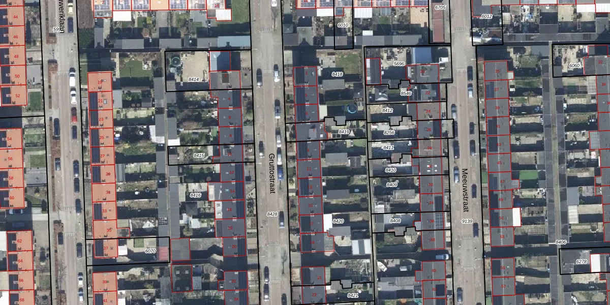 Gruttostraat 9 is gelegen op kadastraal perceel TIE00C8420. Deze kadastrale aanduiding is uniek en wordt gebruikt door het Kadaster om eigendomsrechten en andere zakelijke rechten vast te leggen. Het perceel maakt onderdeel uit van de kadastrale gemeente Tiel.