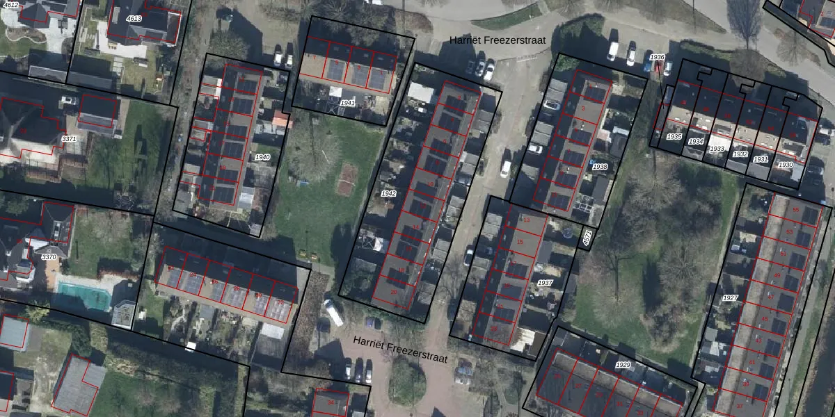 Harriët Freezerstraat 12 is gelegen op kadastraal perceel TIE00H1942. Deze kadastrale aanduiding is uniek en wordt gebruikt door het Kadaster om eigendomsrechten en andere zakelijke rechten vast te leggen. Het perceel maakt onderdeel uit van de kadastrale gemeente Tiel.