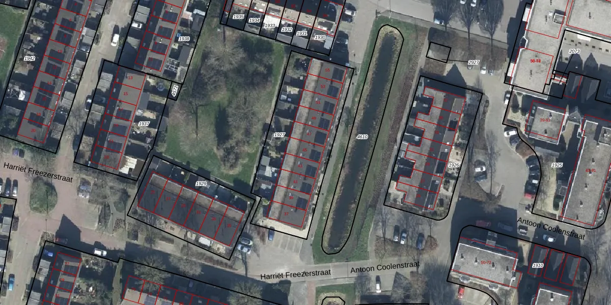 Harriët Freezerstraat 45 is gelegen op kadastraal perceel TIE00H1927. Deze kadastrale aanduiding is uniek en wordt gebruikt door het Kadaster om eigendomsrechten en andere zakelijke rechten vast te leggen. Het perceel maakt onderdeel uit van de kadastrale gemeente Tiel.