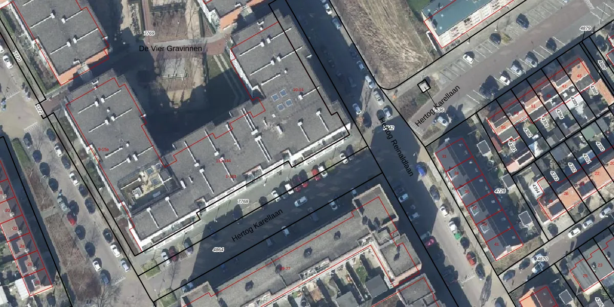 Hertog Karellaan 134 is gelegen op kadastraal perceel TIE00D7769. Deze kadastrale aanduiding is uniek en wordt gebruikt door het Kadaster om eigendomsrechten en andere zakelijke rechten vast te leggen. Het perceel maakt onderdeel uit van de kadastrale gemeente Tiel.