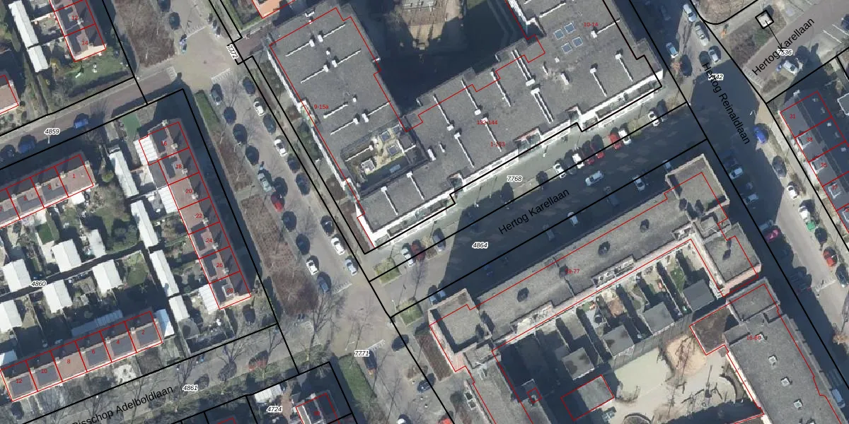 Hertog Karellaan 144 is gelegen op kadastraal perceel TIE00D7769. Deze kadastrale aanduiding is uniek en wordt gebruikt door het Kadaster om eigendomsrechten en andere zakelijke rechten vast te leggen. Het perceel maakt onderdeel uit van de kadastrale gemeente Tiel.