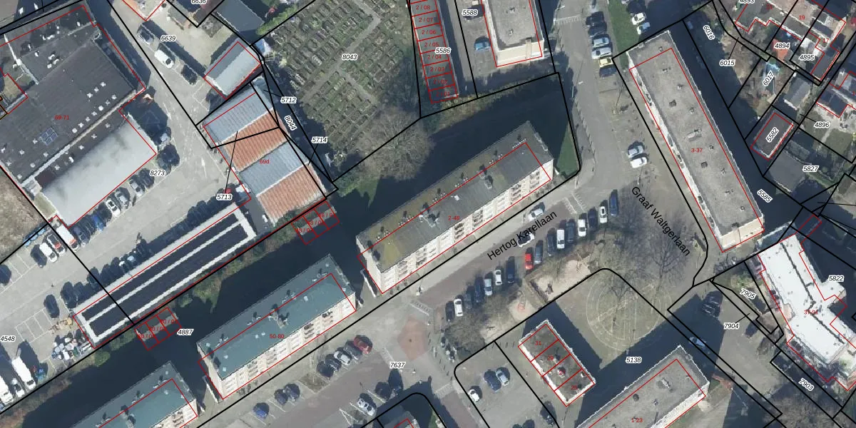 Het perceel waarop Hertog Karellaan 32 staat heeft een oppervlakte van 5790 m². Dit is een zeer groot perceel. De perceeloppervlakte wordt geregistreerd door het Kadaster. Gedetailleerde informatie over de maten van dit perceel kunt u vinden in het rapport Kadastrale kaart met maatvoering van Hertog Karellaan 32.