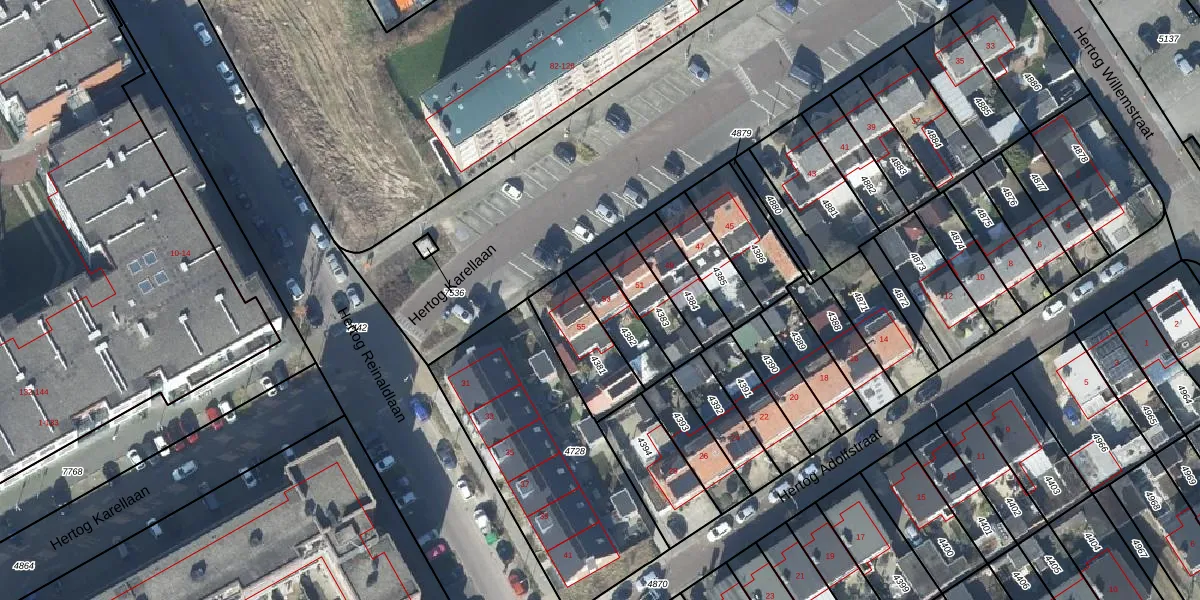 Hertog Karellaan 53 is gelegen op kadastraal perceel TIE00D4382. Deze kadastrale aanduiding is uniek en wordt gebruikt door het Kadaster om eigendomsrechten en andere zakelijke rechten vast te leggen. Het perceel maakt onderdeel uit van de kadastrale gemeente Tiel.