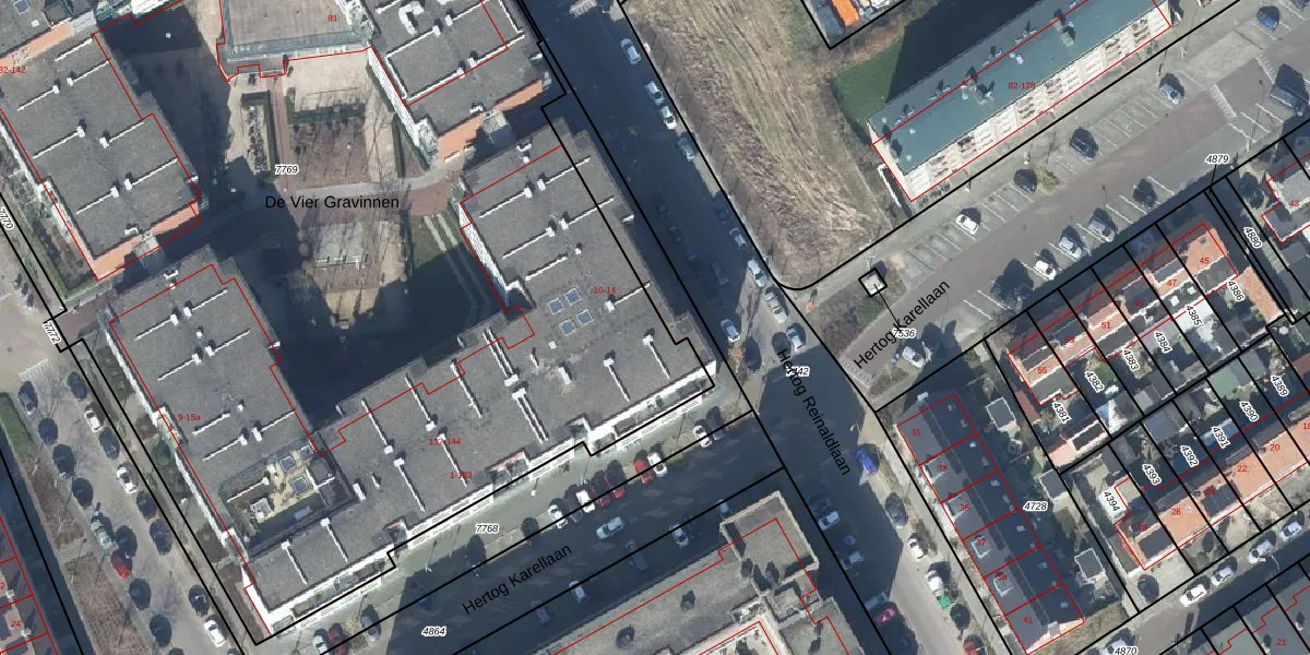 Hertog Reinaldlaan 14 is gelegen op kadastraal perceel TIE00D7769. Deze kadastrale aanduiding is uniek en wordt gebruikt door het Kadaster om eigendomsrechten en andere zakelijke rechten vast te leggen. Het perceel maakt onderdeel uit van de kadastrale gemeente Tiel.