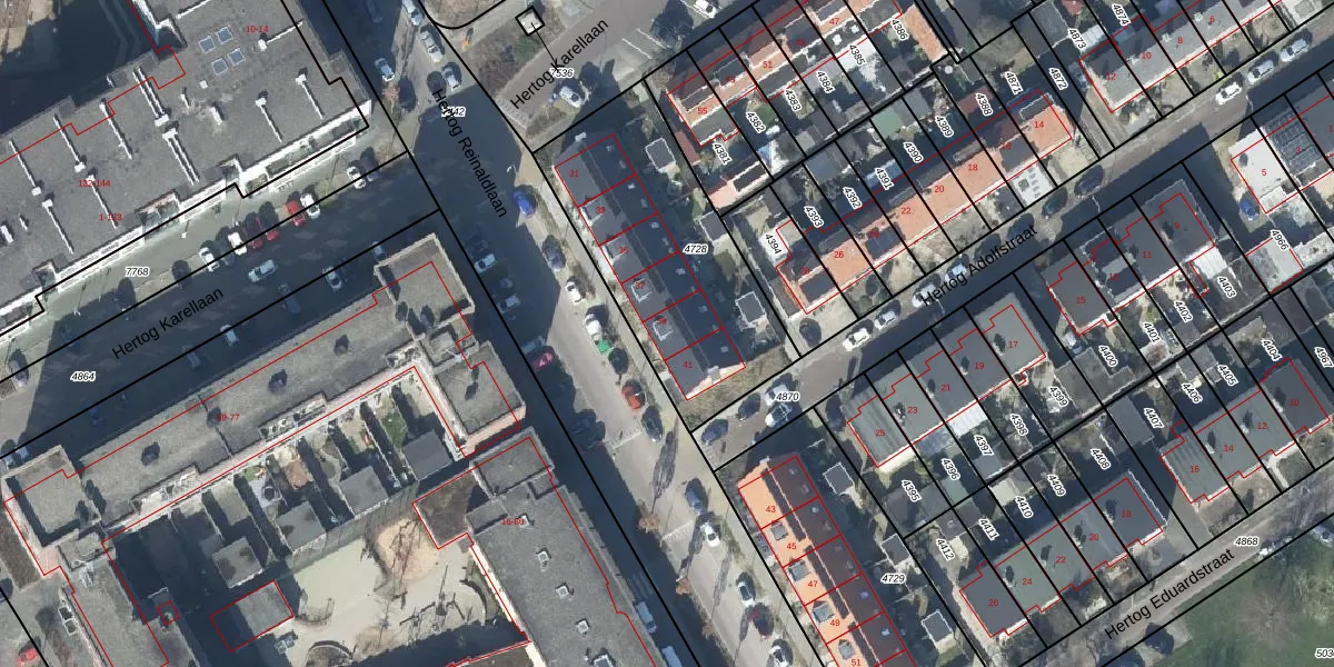 Het perceel waarop Hertog Reinaldlaan 39 staat heeft een oppervlakte van 950 m². Dit is een groot perceel. De perceeloppervlakte wordt geregistreerd door het Kadaster. Gedetailleerde informatie over de maten van dit perceel kunt u vinden in het rapport Kadastrale kaart met maatvoering van Hertog Reinaldlaan 39.