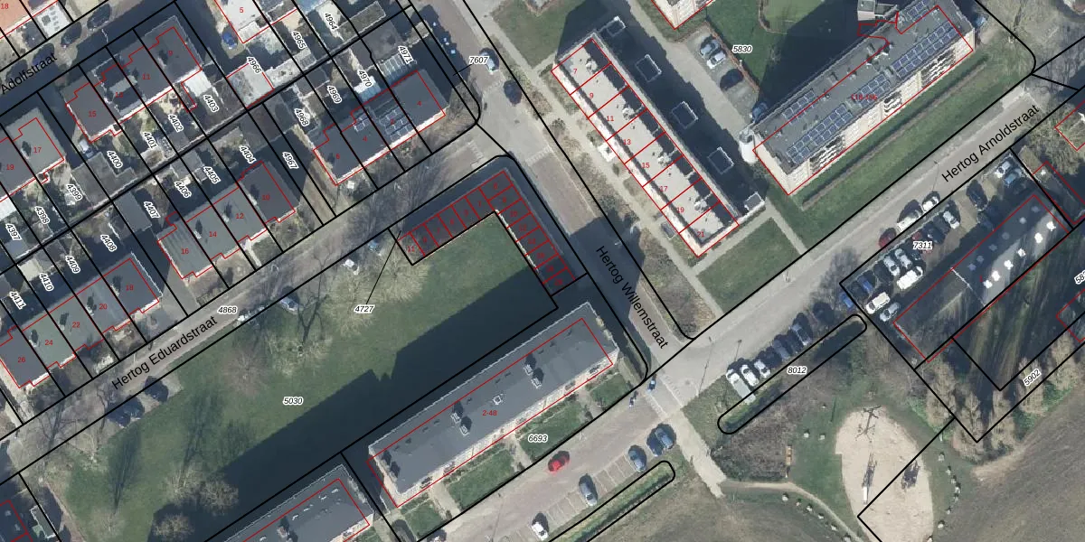 Hertog Willemstraat 18 is gelegen op kadastraal perceel TIE00D4727. Deze kadastrale aanduiding is uniek en wordt gebruikt door het Kadaster om eigendomsrechten en andere zakelijke rechten vast te leggen. Het perceel maakt onderdeel uit van de kadastrale gemeente Tiel.