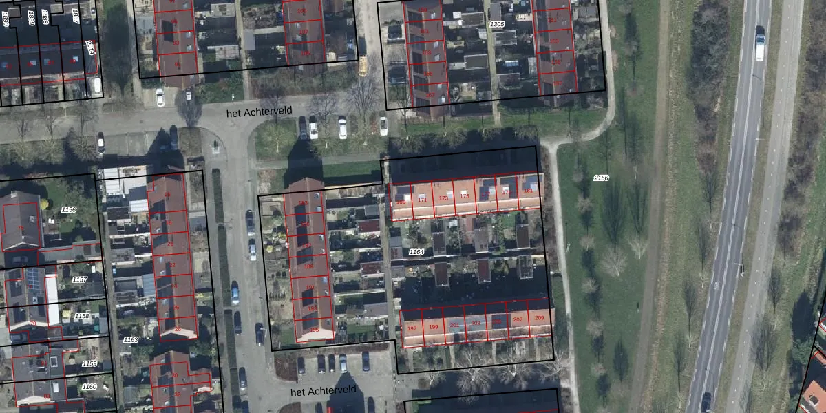 het Achterveld 171 is gelegen op kadastraal perceel TIE00G1164. Deze kadastrale aanduiding is uniek en wordt gebruikt door het Kadaster om eigendomsrechten en andere zakelijke rechten vast te leggen. Het perceel maakt onderdeel uit van de kadastrale gemeente Tiel.