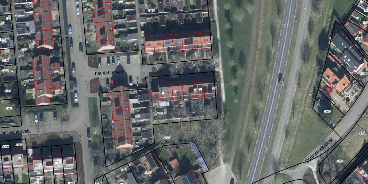 het Achterveld 215 is gelegen op kadastraal perceel TIE00G1261. Deze kadastrale aanduiding is uniek en wordt gebruikt door het Kadaster om eigendomsrechten en andere zakelijke rechten vast te leggen. Het perceel maakt onderdeel uit van de kadastrale gemeente Tiel.