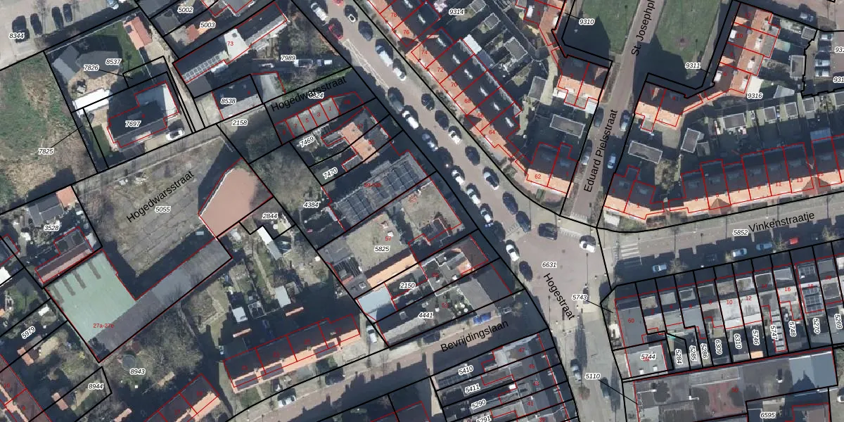 Hogestraat 57 is gelegen op kadastraal perceel TIE00C5825. Deze kadastrale aanduiding is uniek en wordt gebruikt door het Kadaster om eigendomsrechten en andere zakelijke rechten vast te leggen. Het perceel maakt onderdeel uit van de kadastrale gemeente Tiel.