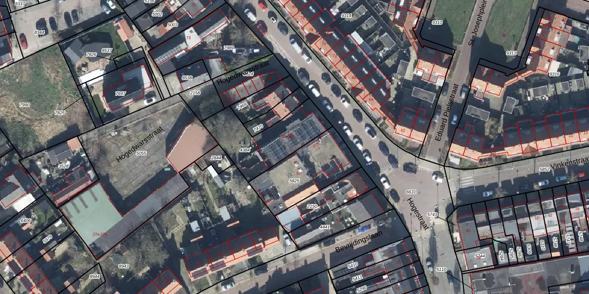 Het perceel waarop Hogestraat 63-d staat heeft een oppervlakte van 555 m². Dit is een groot perceel. De perceeloppervlakte wordt geregistreerd door het Kadaster. Gedetailleerde informatie over de maten van dit perceel kunt u vinden in het rapport Kadastrale kaart met maatvoering van Hogestraat 63-d.