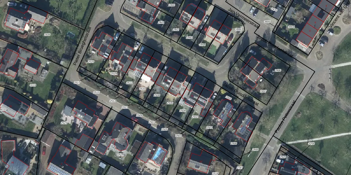 Jacob Ruisdaelstraat 13 is gelegen op kadastraal perceel TIE00H2506. Deze kadastrale aanduiding is uniek en wordt gebruikt door het Kadaster om eigendomsrechten en andere zakelijke rechten vast te leggen. Het perceel maakt onderdeel uit van de kadastrale gemeente Tiel.
