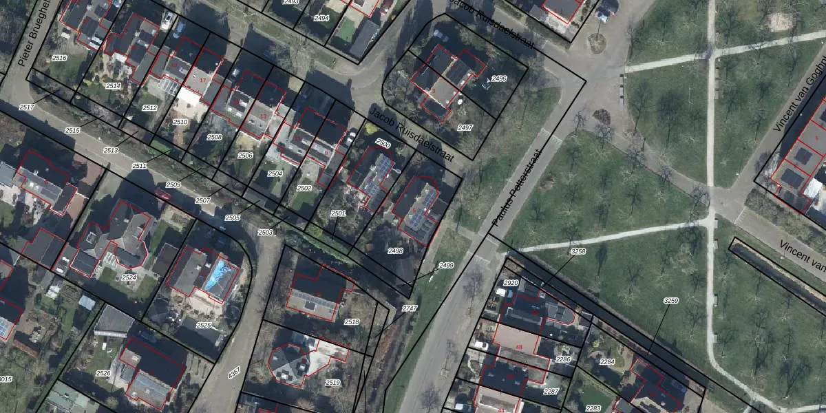 Jacob Ruisdaelstraat 5 is gelegen op kadastraal perceel TIE00H2498. Deze kadastrale aanduiding is uniek en wordt gebruikt door het Kadaster om eigendomsrechten en andere zakelijke rechten vast te leggen. Het perceel maakt onderdeel uit van de kadastrale gemeente Tiel.