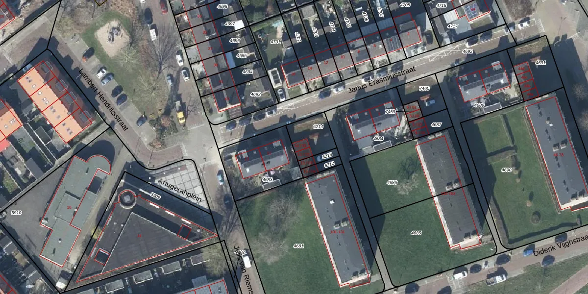 Janus Erasmiusstraat 11-01 is gelegen op kadastraal perceel TIE00D6214. Deze kadastrale aanduiding is uniek en wordt gebruikt door het Kadaster om eigendomsrechten en andere zakelijke rechten vast te leggen. Het perceel maakt onderdeel uit van de kadastrale gemeente Tiel.