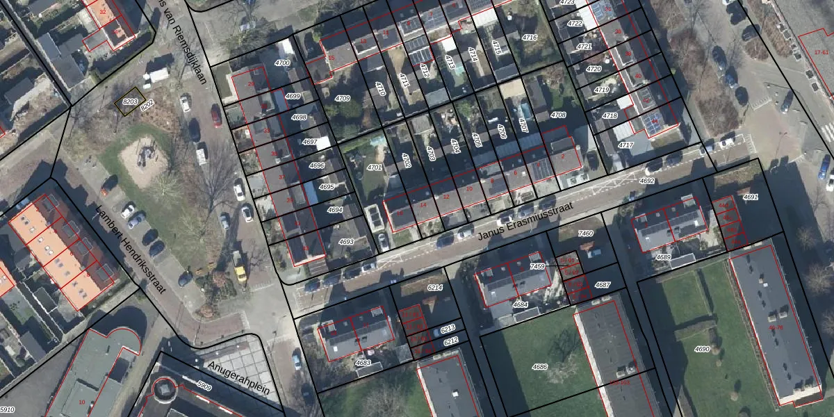 Janus Erasmiusstraat 14 is gelegen op kadastraal perceel TIE00D4702. Deze kadastrale aanduiding is uniek en wordt gebruikt door het Kadaster om eigendomsrechten en andere zakelijke rechten vast te leggen. Het perceel maakt onderdeel uit van de kadastrale gemeente Tiel.