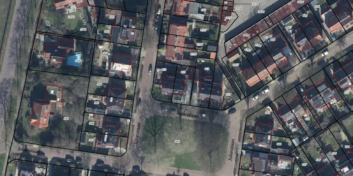 Julianalaan 16 is gelegen op kadastraal perceel TIE00H612. Deze kadastrale aanduiding is uniek en wordt gebruikt door het Kadaster om eigendomsrechten en andere zakelijke rechten vast te leggen. Het perceel maakt onderdeel uit van de kadastrale gemeente Tiel.